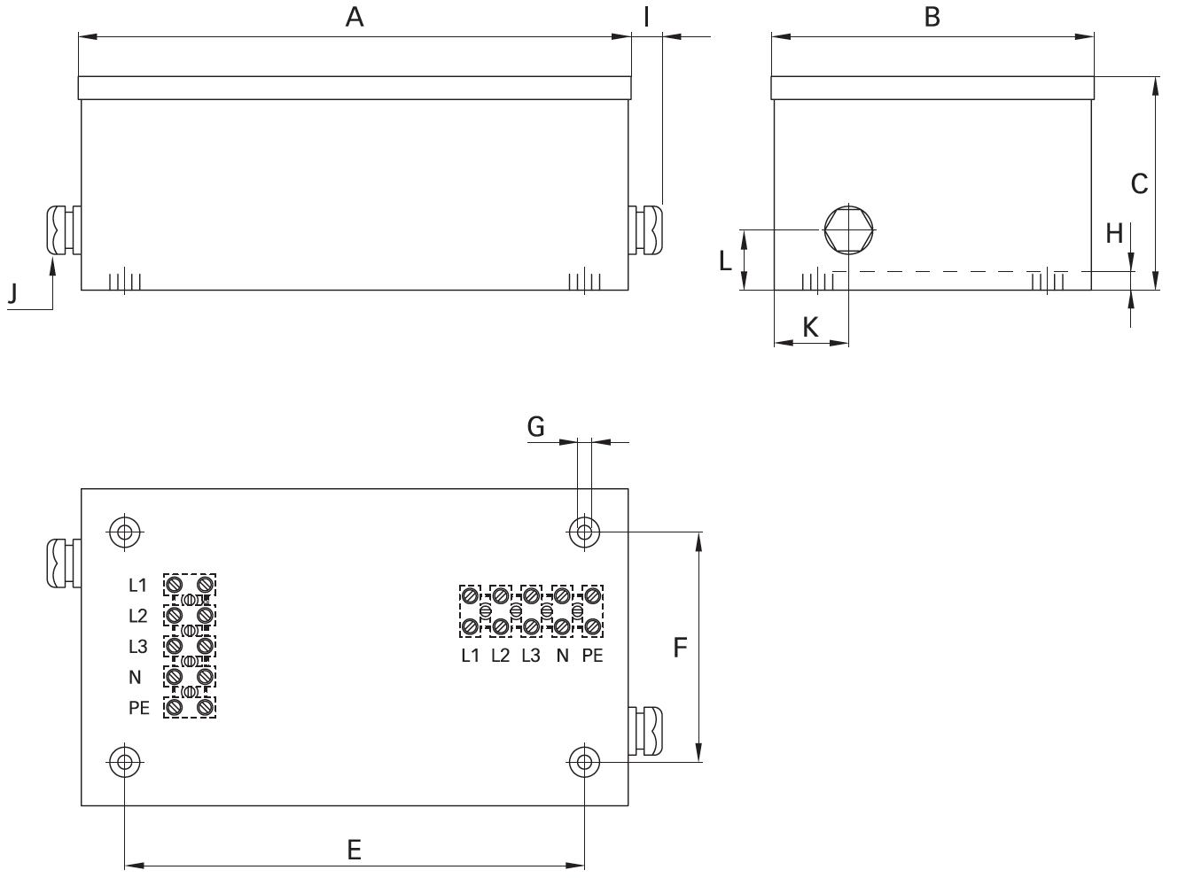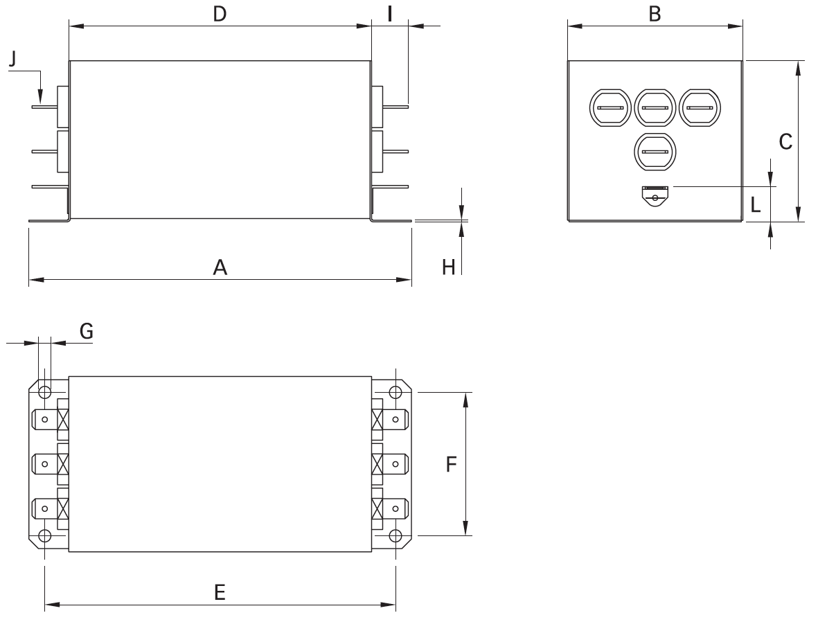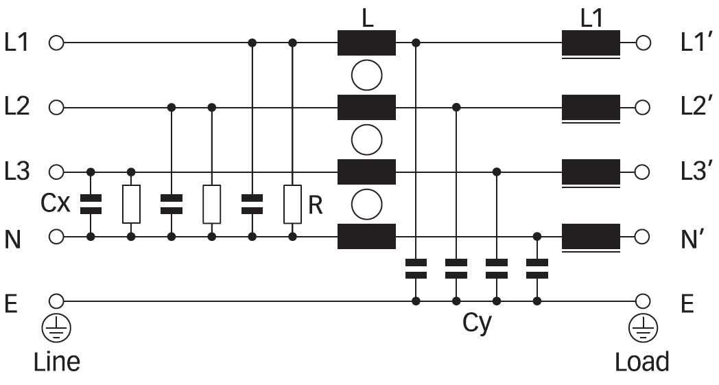 - Advanced two-stage filter circuits with highly saturating resistant toroidal inductors, in conjunction with feedthrough capacitors on each of the three phases and the neutral line, ensure that these filters provide very high attenuation in the upper frequency band.